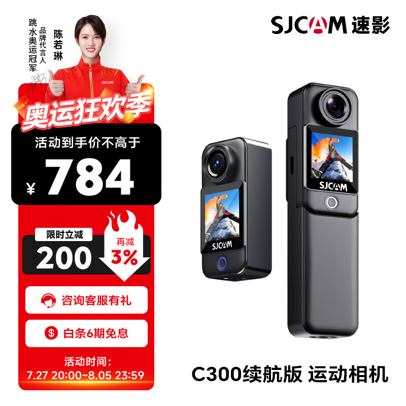 SJCAM速影 C300续航版360运动相机摩托车行车记录仪拇指相机防抖防水黑色64G+配件包价格:784.00元!