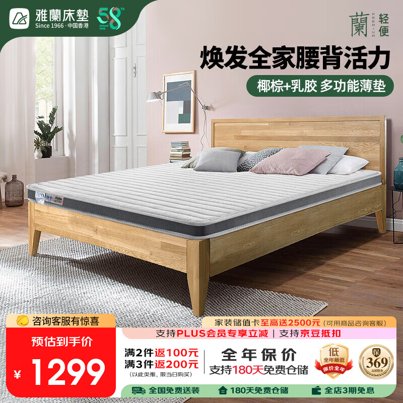 雅兰(AIRLAND)椰棕床垫舒脊薄床垫宿舍床垫 硬核乳胶椰棕款【5cm】1.35*2米价格:1599.00元!