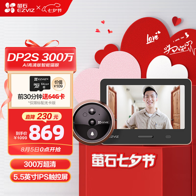 萤石(EZVIZ)DP2S 300万超清智能猫眼摄像头 海康威视旗下家用可视猫眼门铃 手机远程视频监控价格:869.00元!
