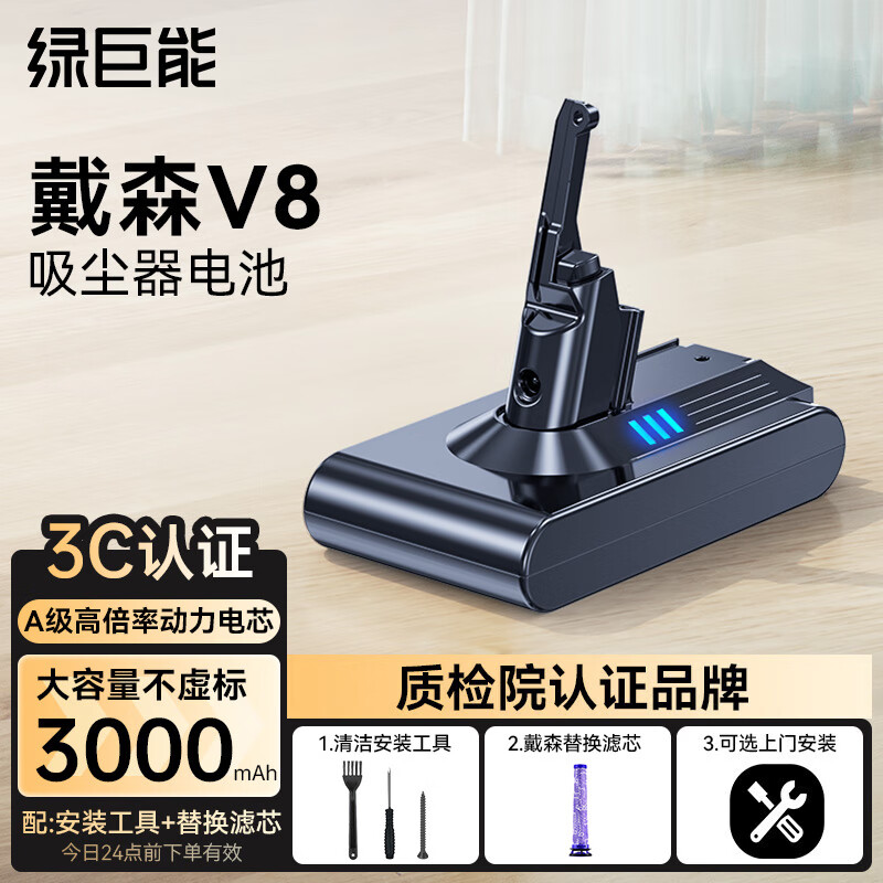 绿巨能(llano)适用戴森Dyson电池V8吸尘器充电锂电池V8 Fluffy/Absolute/Animal Pro/PM8.SV10型号 3000mAh价格:249.00元!