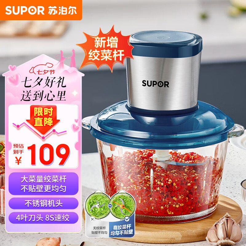 苏泊尔(SUPOR)绞肉机家用 辅食机 绞馅机 电动多功能料理机婴儿打泥机碎肉切菜搅拌机JR53-U价格:109.00元!