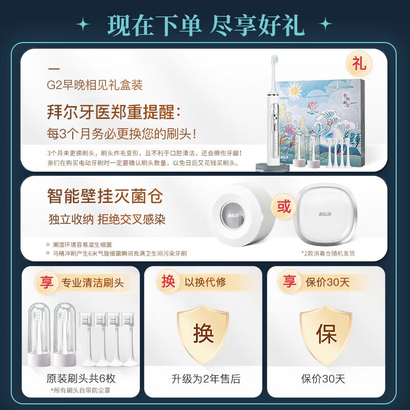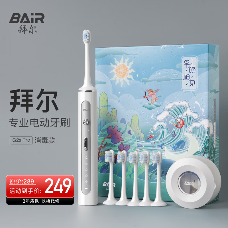 拜尔(BAIR)G2 Pro 高端消毒旗舰机 电动牙刷成人震动充电智能声波学生情侣全自动男士女送朋友礼物 礼盒装 薄雾灰【G2s Pro 灭菌款】价格:289.00元!
