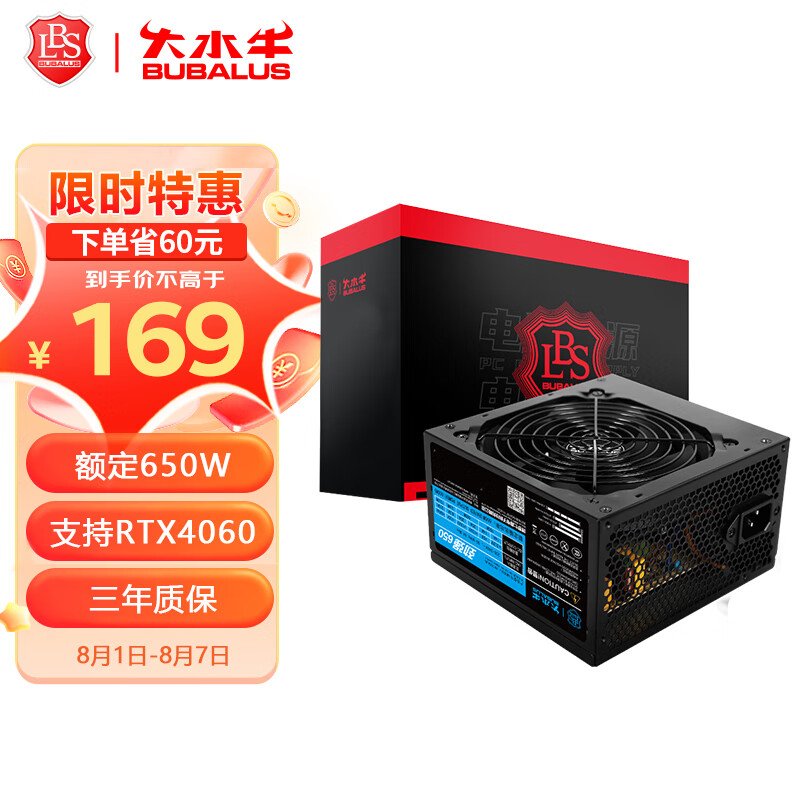 大水牛(BUBALUS)额定650W 劲强650台式电脑主机电源(支持4060显卡/主动式PFC/12CM风扇/智能温控/支持背线)价格:169.00元!
