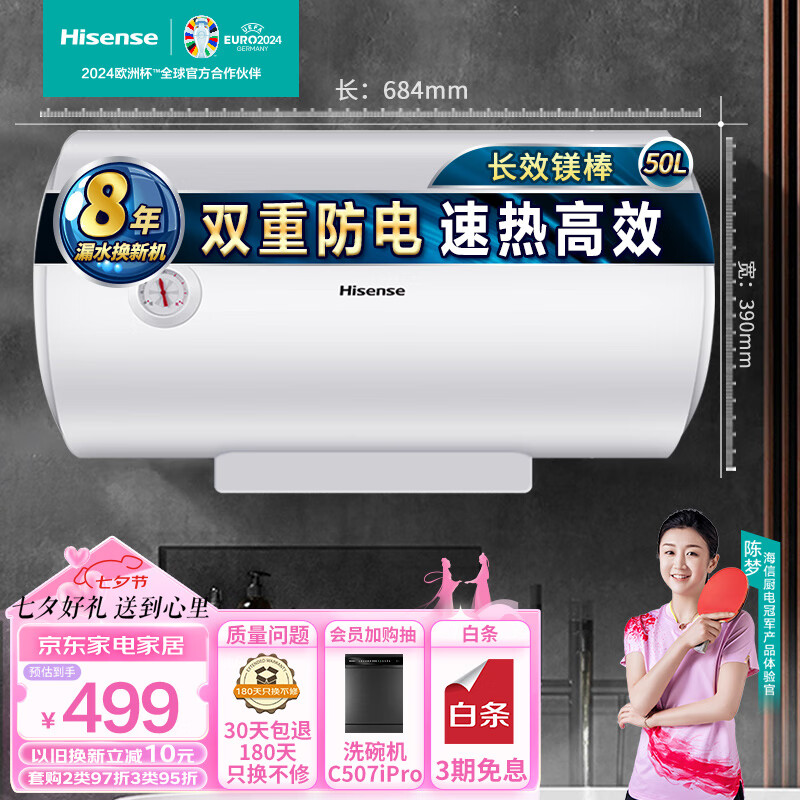海信(Hisense)50升家用电热水器2100W速热加粗长效镁棒操控简单升级防电墙双重保护DC50-W1311【以旧换新】价格:499.00元!
