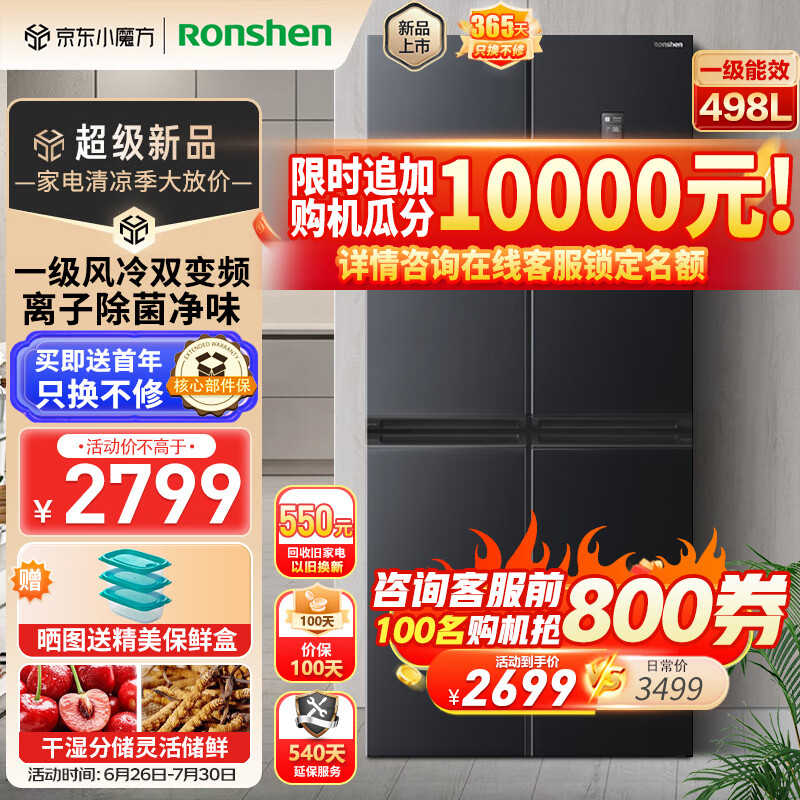 容声(Ronshen)498升十字对开门家用一级双变频双循环风冷无霜超薄嵌入式大容量四开门电冰箱BCD-498WD11FP价格:3499.00元!