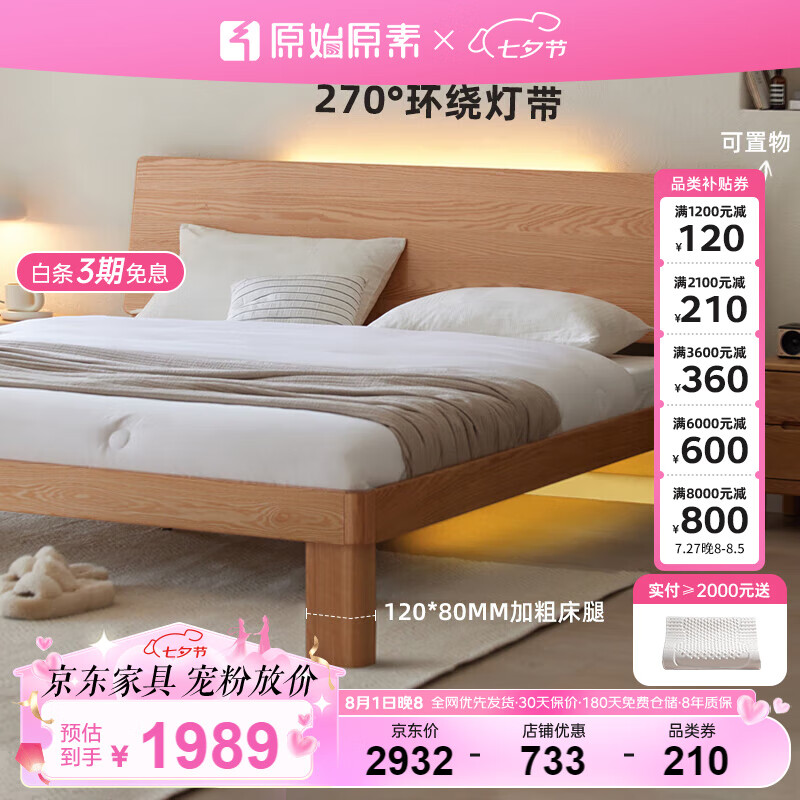 原始原素实木床现代简约1.8米橡木大床北欧夜灯双人床JD1857-高体价格:2932.00元!
