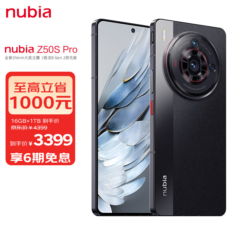 nubia努比亚Z50S Pro 16GB+1T黑咖 第二代骁龙8版 35mm高定大底主摄 1.5K直屏 5G手机游戏拍照价格:3399.00元!