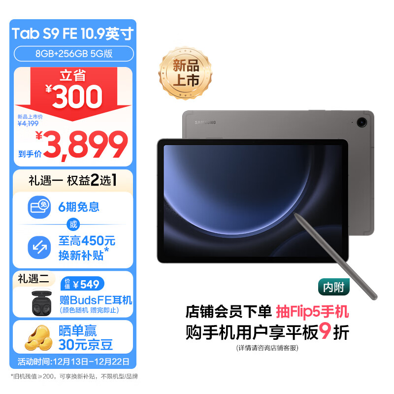 三星平板电脑2023款Tab S9 FE 10.9英寸 8+256GB 5G版 护眼高清高亮度大屏IP68防水Spen学生网课办公 石墨灰价格:3899.00元!