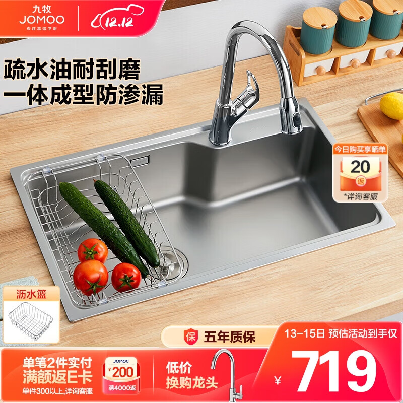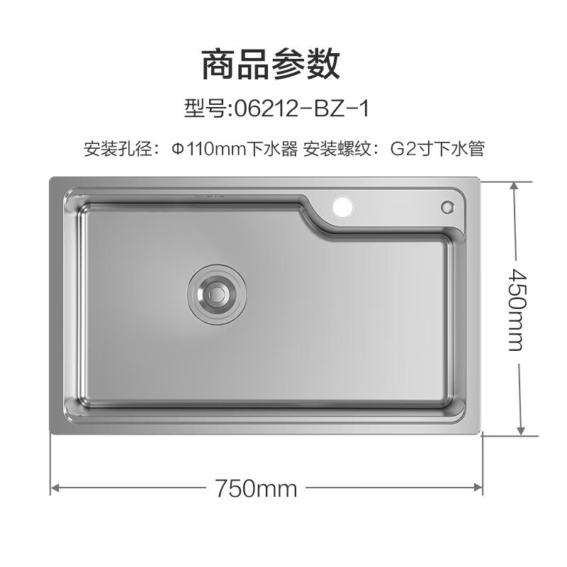 九牧(JOMOO)304不锈钢水槽纳米抗菌单槽厨房洗菜盆75*45(无龙头)06212-BZ-1价格:919.00元!