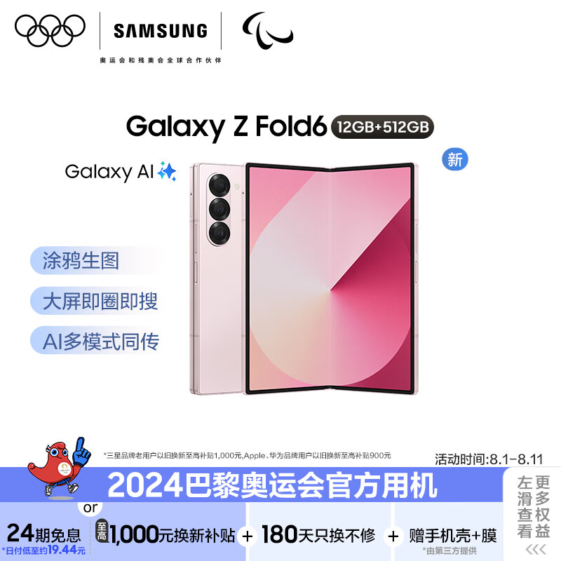 三星(SAMSUNG)Galaxy Z Fold6 大屏AI手机 超轻薄折叠屏手机 第三代骁龙8 游戏手机 12GB+512GB 浅玫粉价格:13999.00元!