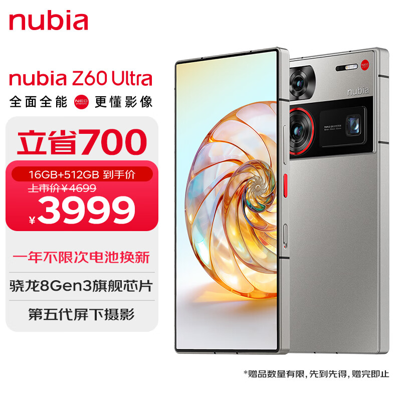 nubia 努比亚Z60 Ultra 屏下摄像16GB+512GB 银河 第三代骁龙8 三主摄OIS 5G手机游戏拍照努比亚手机价格:3899.00元!