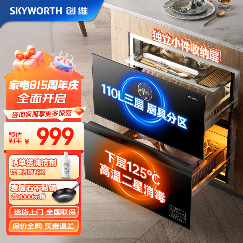 创维(Skyworth)消毒柜嵌入式家用 双抽内三层大容量二星消毒餐具碗柜碗筷婴儿奶瓶 X21A价格:999.00元!