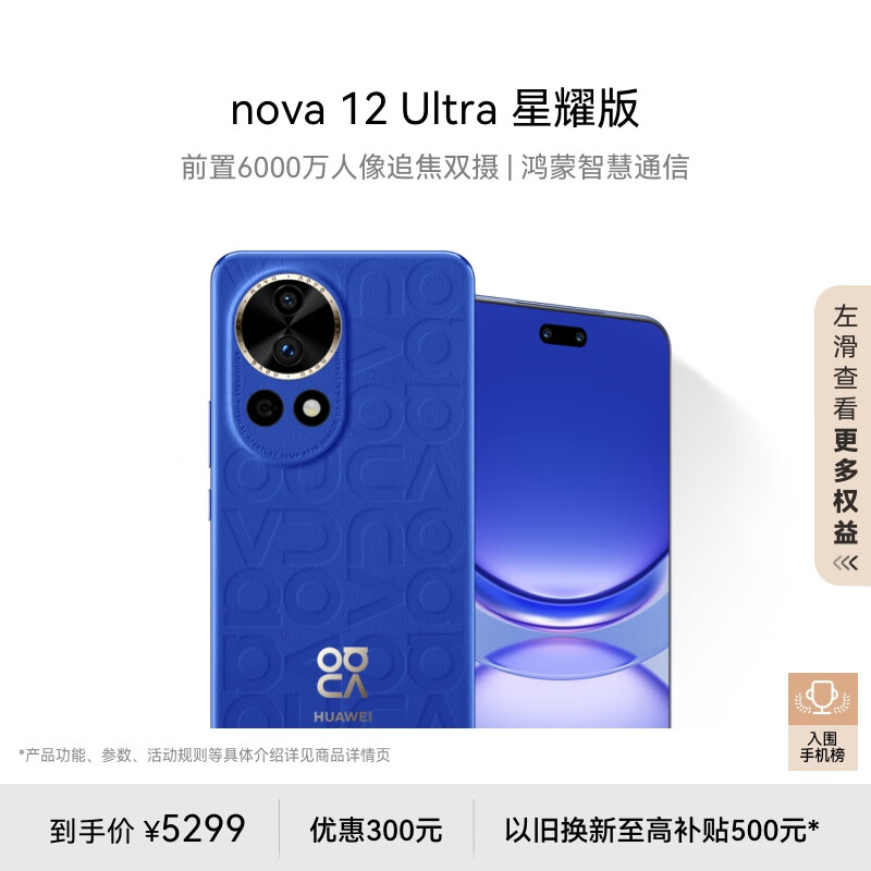 HUAWEI nova 12 Ultra 星耀版 前置6000万人像追焦双摄 1TB 12号色 鸿蒙智慧通信华为智能手机价格:5299.00元!