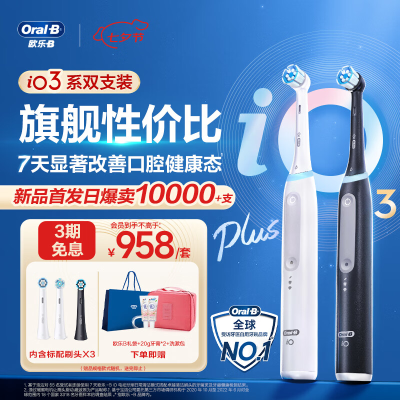 欧乐B成人电动牙刷iO3智净磁波刷 到手2支牙刷 iO系列博朗技术深度自动清洁送男生送新人新婚礼物价格:958.00元!