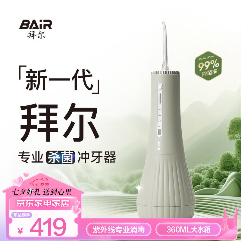 拜尔M11 智能杀菌电动冲牙器 专业LED智显水牙线大水箱家用正畸专用牙齿清洁洗牙神器礼盒 1号塔灰豆绿价格:469.00元!