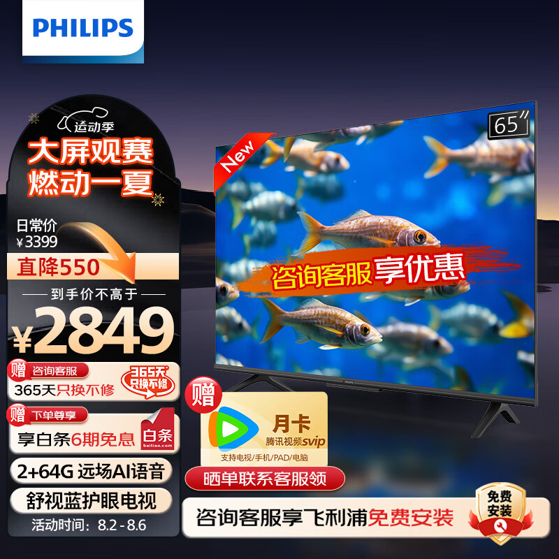 飞利浦(PHILIPS)65英寸 4K超高清智慧屏2+64G舒视蓝护眼远场AI语音智能液晶平板电视机65PUF7359/T3价格:2849.00元!