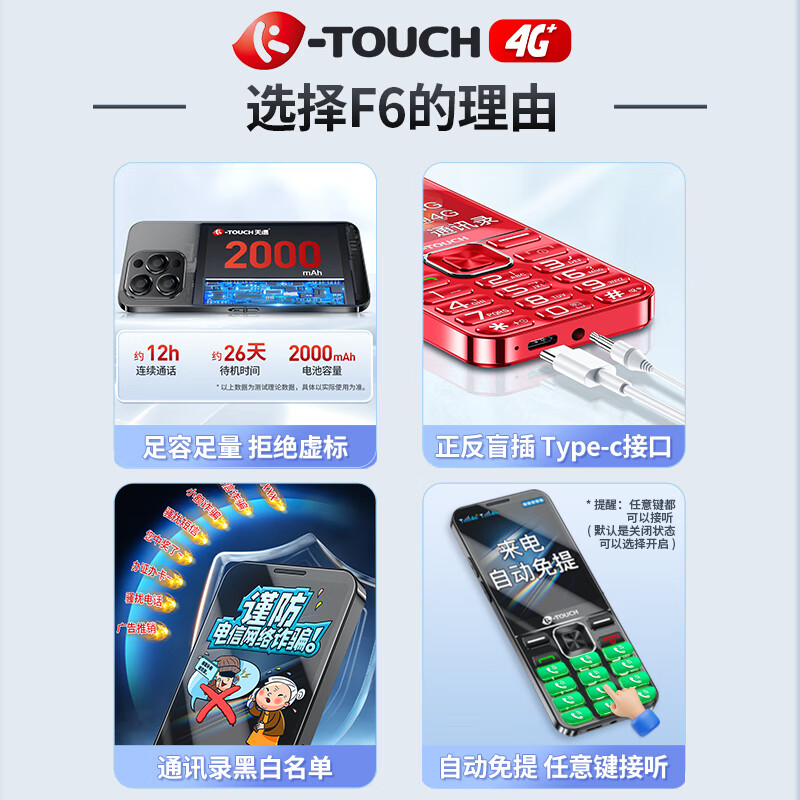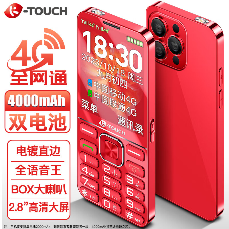 天语(K-TOUCH)F6 通4G老年人手机2.8高清大屏超长待机老年机超薄机身大字体大声音中小学生备用机 活力红价格:239.00元!