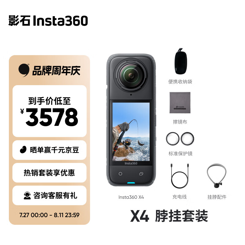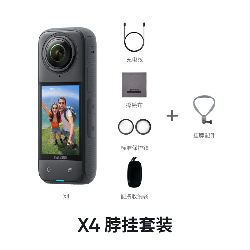 Insta360影石 X4 全景运动相机8K高清防抖防水摄像机Vlog摩托车骑行滑雪潜水路亚(脖挂套装标配版)价格:3578.00元!