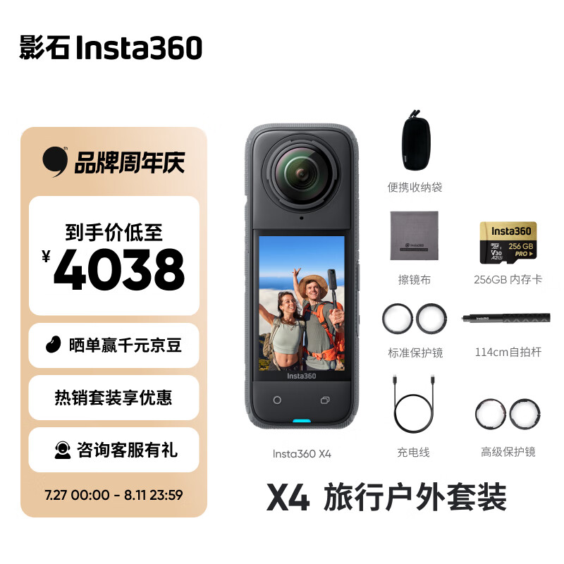 Insta360影石 X4 全景运动相机8K高清防抖防水摄像机Vlog摩托车骑行滑雪潜水路亚(旅行户外套装256G版)价格:4038.00元!