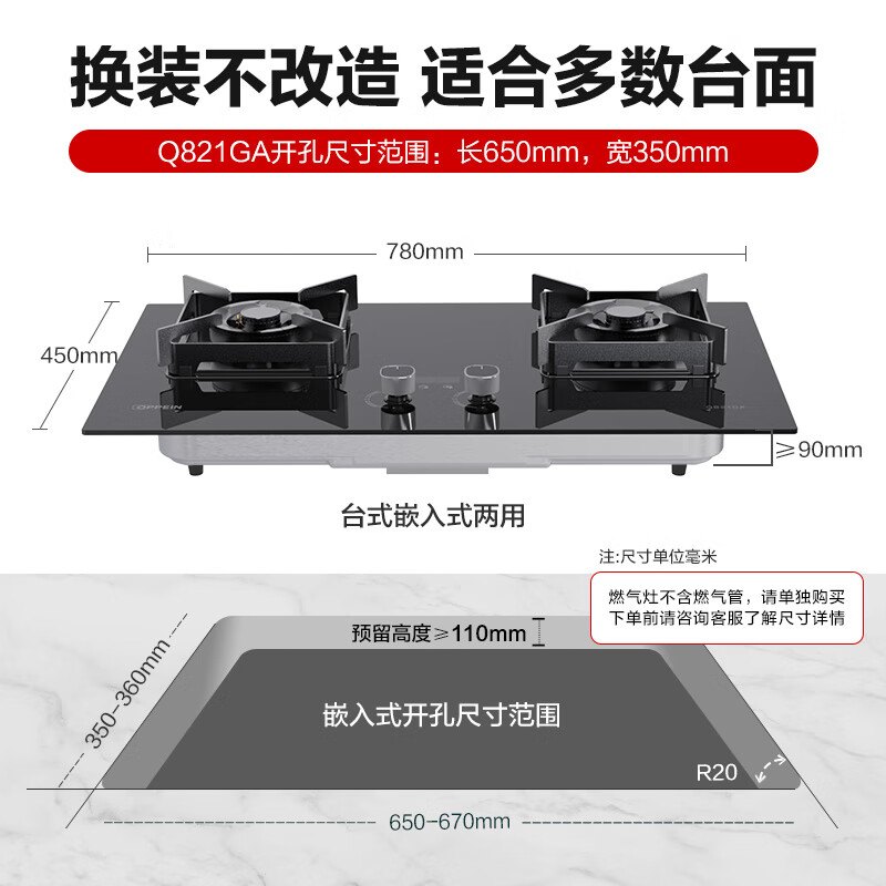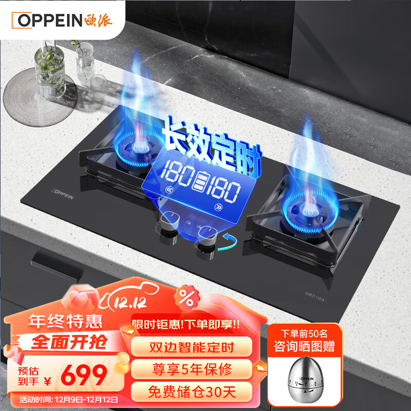 欧派(OPPEIN)燃气灶 天然气 家用双灶5.0KW火力猛火灶 180min智能定时 加大内铜火盖台嵌两用JZT-Q821GA价格:699.00元!