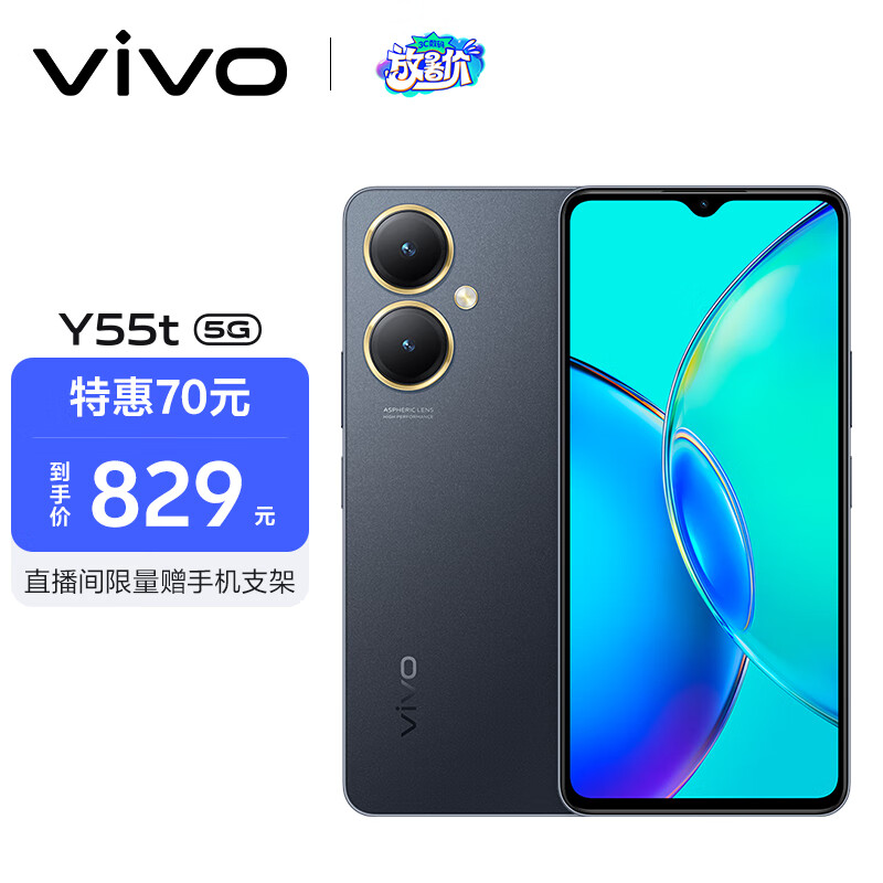 vivo Y55t 6GB+128GB 星环黑 5000万超清影像 200%大音量 5000mAh大电池 5G 拍照 手机价格:899.00元!