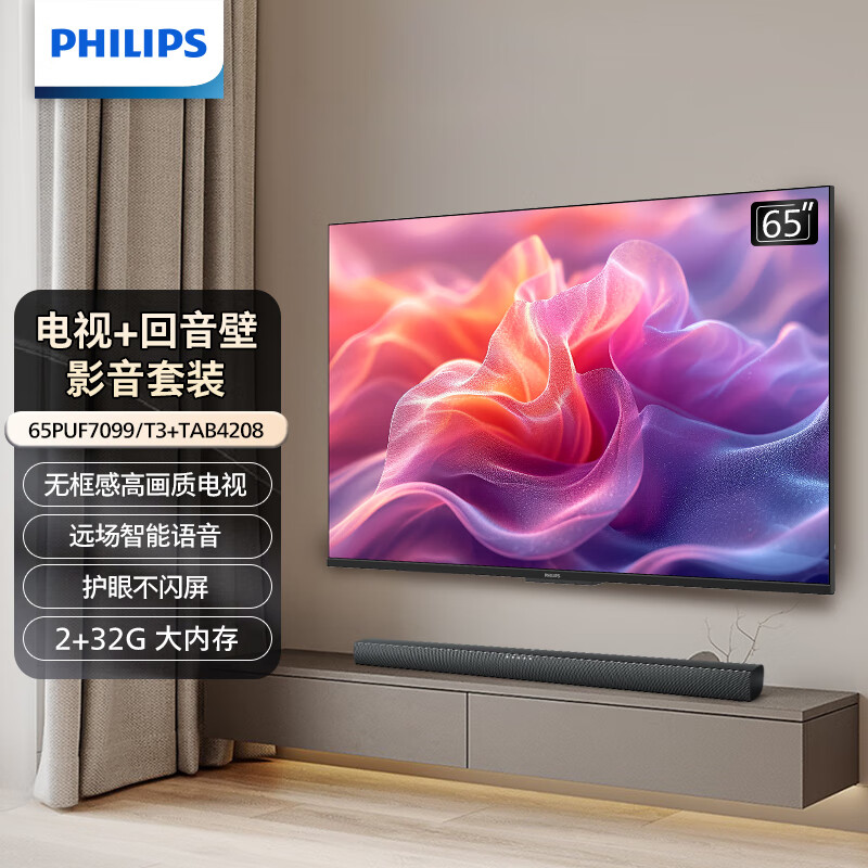 飞利浦(PHILIPS)65PUF7099/T3+TAB4208 电视回音壁组套 娱乐观影套装65英寸屏杜比全景声大功率价格:3228.00元!