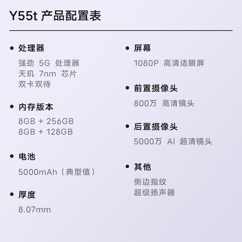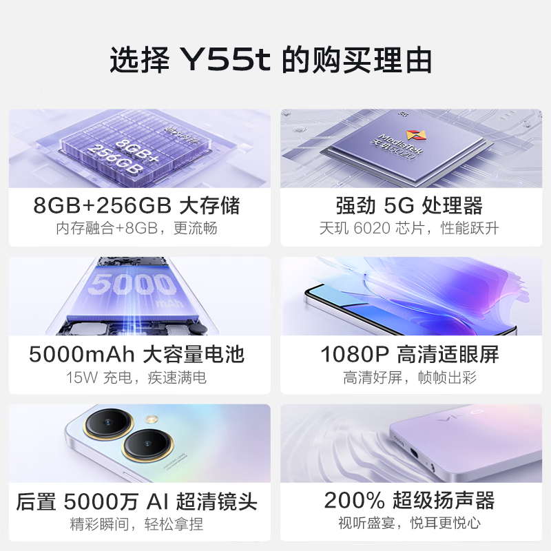 vivo Y55t 6GB+128GB 星云紫 5000万超清影像 200%大音量 5000mAh大电池 5G 拍照 手机价格:899.00元!