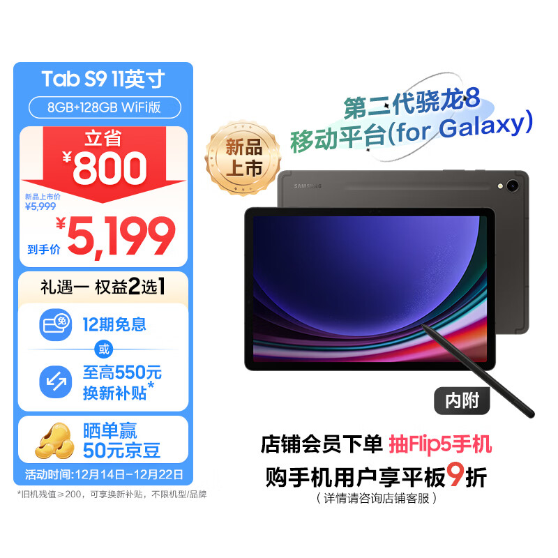 三星(SAMSUNG)平板电脑2023款Tab S9 11英寸 8G+128GB WIFI 骁龙8Gen2 顺滑全视屏 内附Spen 云影灰价格:5199.00元!