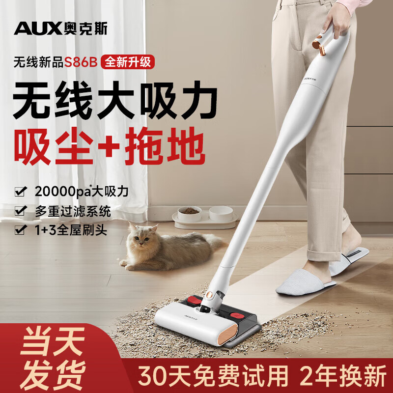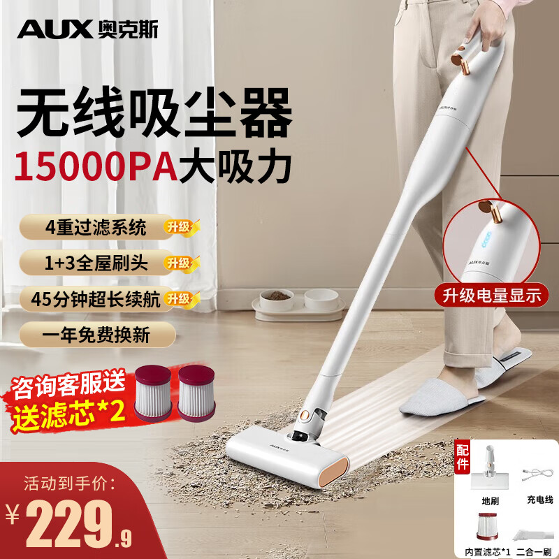 奥克斯家用无线吸尘器大吸力强力小型手持式吸尘器吸拖地多功能一体机扫吸猫毛AXC-15DS86 有刷电机标准版【15000Pa吸力】价格:279.90元!