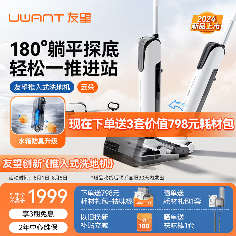 uwant友望 【新升级水箱防臭系统】 推入式平躺180°智能洗地机 自动清洗吸拖一体拖地机 云朵D100价格:1999.00元!