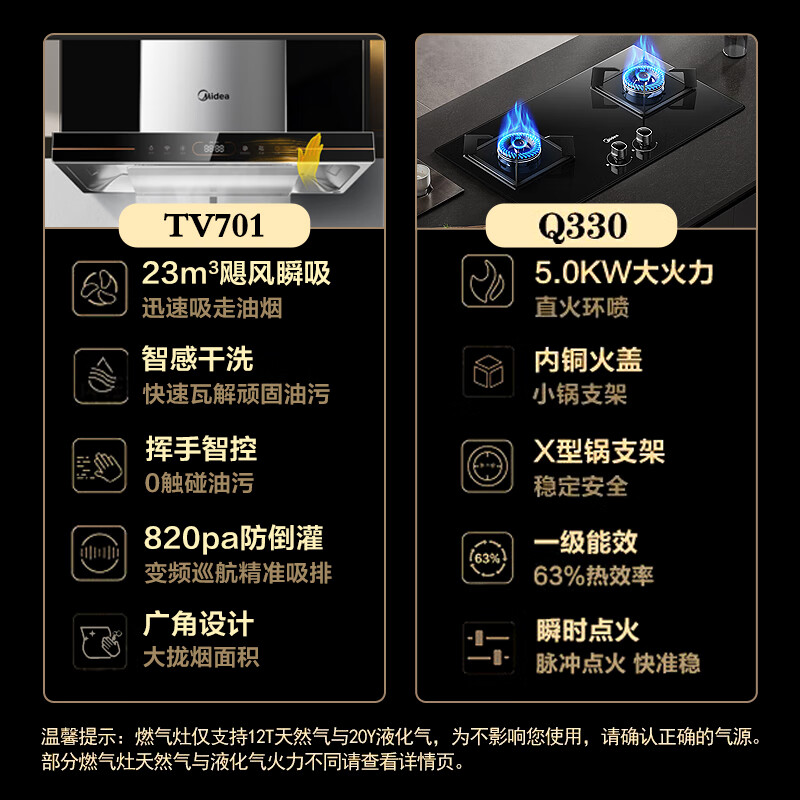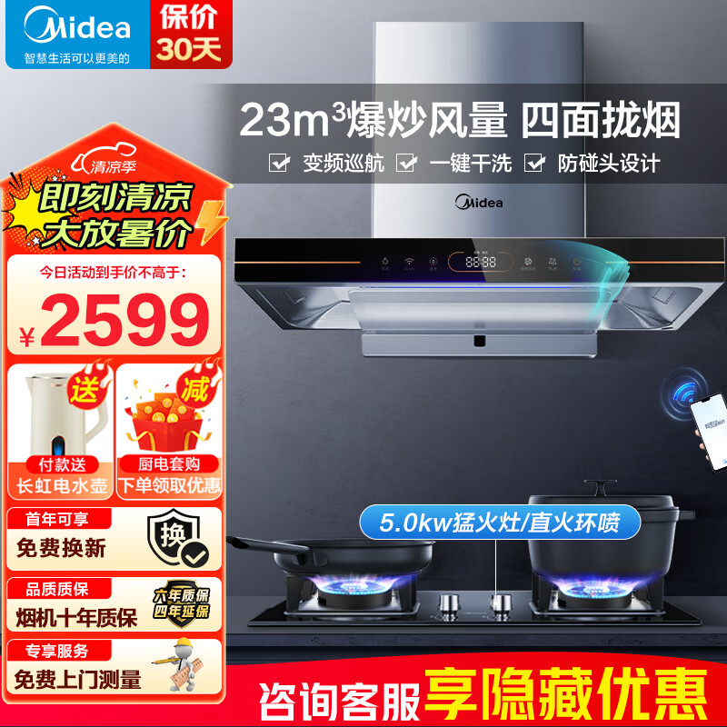 美的(Midea)家用抽油烟机23立方大吸力欧式顶吸油烟机燃气灶具两件烟灶套装一键清洁厨房电器天然气TV701+Q330价格:2599.00元!