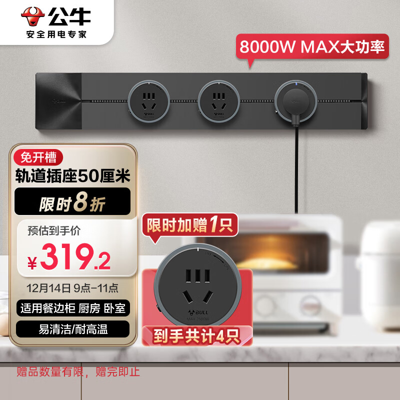 公牛(BULL)明装 轨道插座 可移动墙壁插座壁挂式/插线板/接线板 多功能免打孔 50厘米轨道+3个五孔插座黑色价格:399.00元!