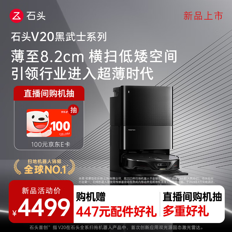 石头(roborock)超薄扫地机器人扫拖一体 V20黑武士 扫拖洗烘一体机 自动集尘热水洗拖布烘干补水擦地拖地 A2050RR V20水箱版价格:4499.00元!