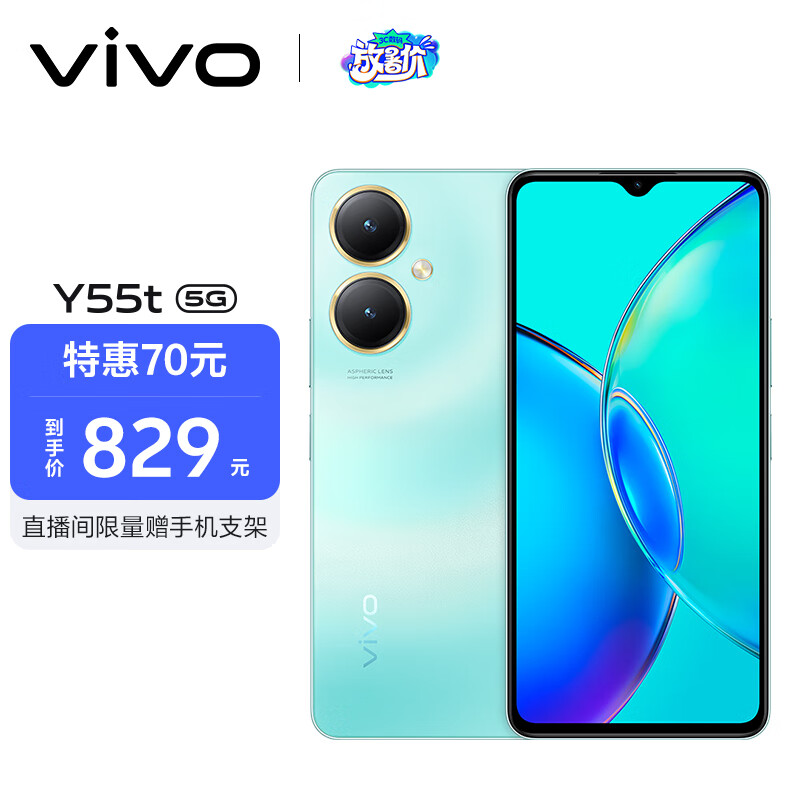 vivo Y55t 6GB+128GB 盐湖蓝 5000万超清影像 200%大音量 5000mAh大电池 5G 拍照 手机价格:899.00元!