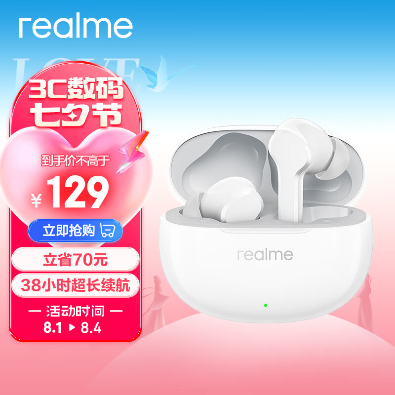 真我(realme)Buds T110 无线蓝牙耳机 38小时超长续航 10mm 低音大动圈 AI通话降噪 华为苹果手机通用 流行白价格:129.00元!