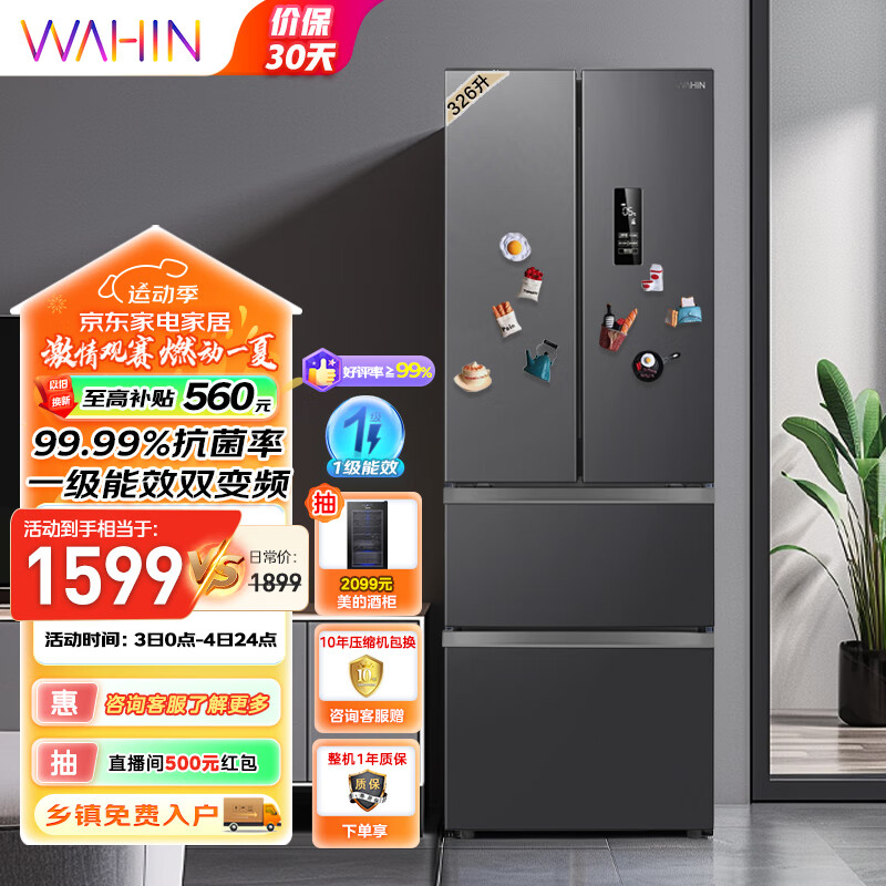 华凌326升法式多门一级能效双变频风冷无霜家用电冰箱节能保鲜净味居家冰箱BCD-326WFPH价格:1799.00元!
