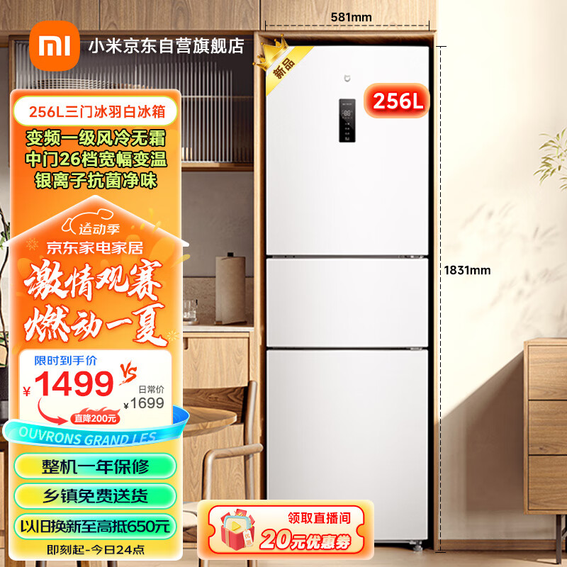 米家小米256升变频一级风冷无霜三门小型家用电冰箱 超薄小占地白色银离子除菌净味 BCD-256WMSA价格:1499.00元!