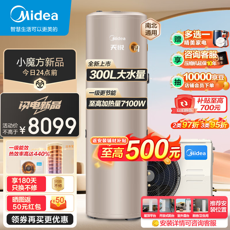 美的(Midea)空气能热水器家用300升超一级能效75℃高温R32冷媒带电辅天悦RSJF-51/DN8-300C(E1)价格:8599.00元!
