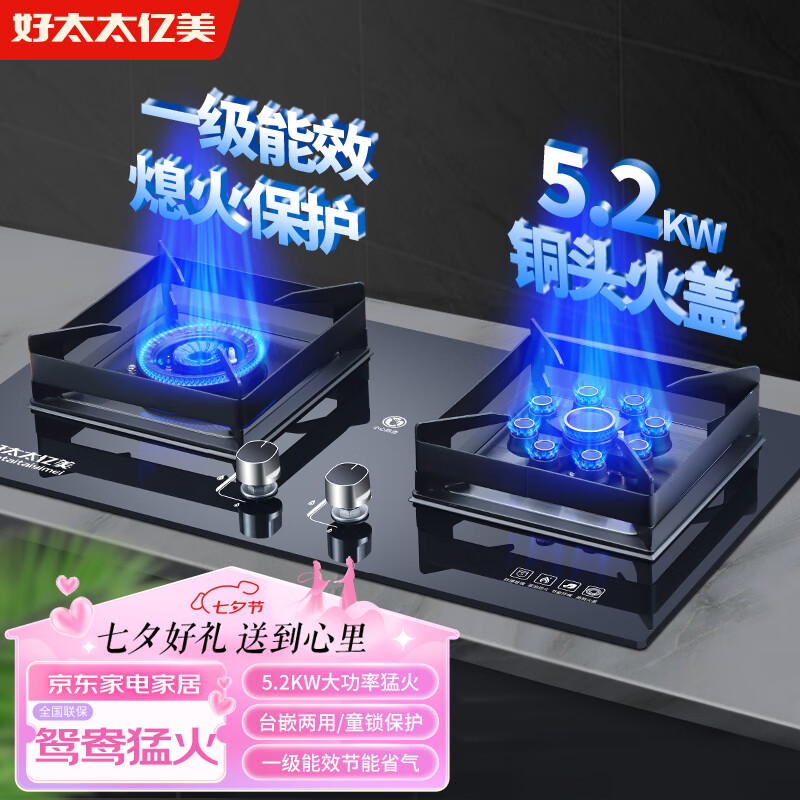 好太太亿美天然气燃气灶双灶家用煤气灶5.2KW猛火台式嵌入式猛火炉具玻璃方架鸳鸯灶上门安装JZT-K06T价格:399.00元!