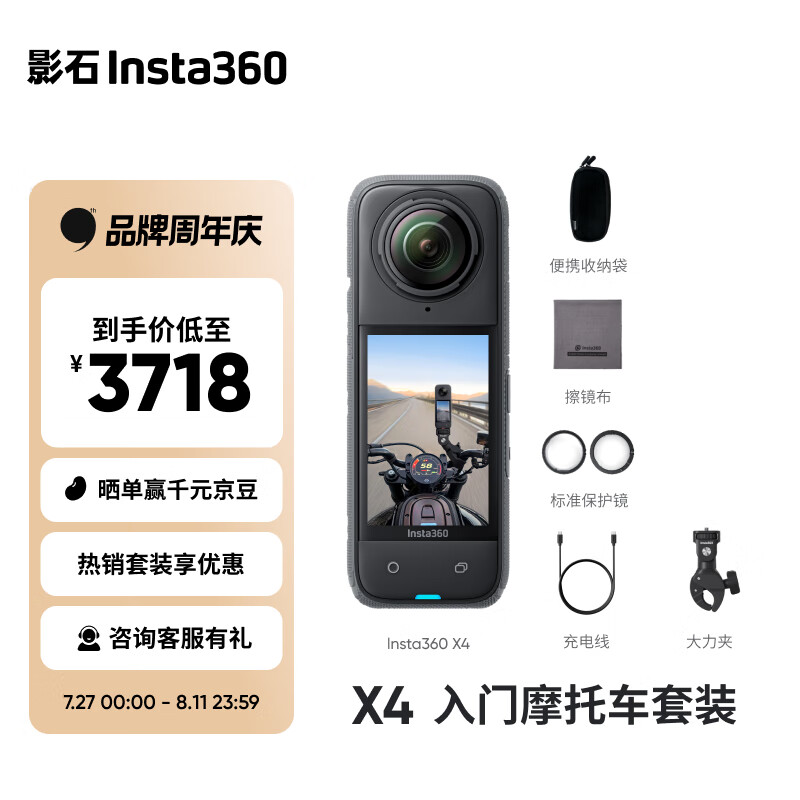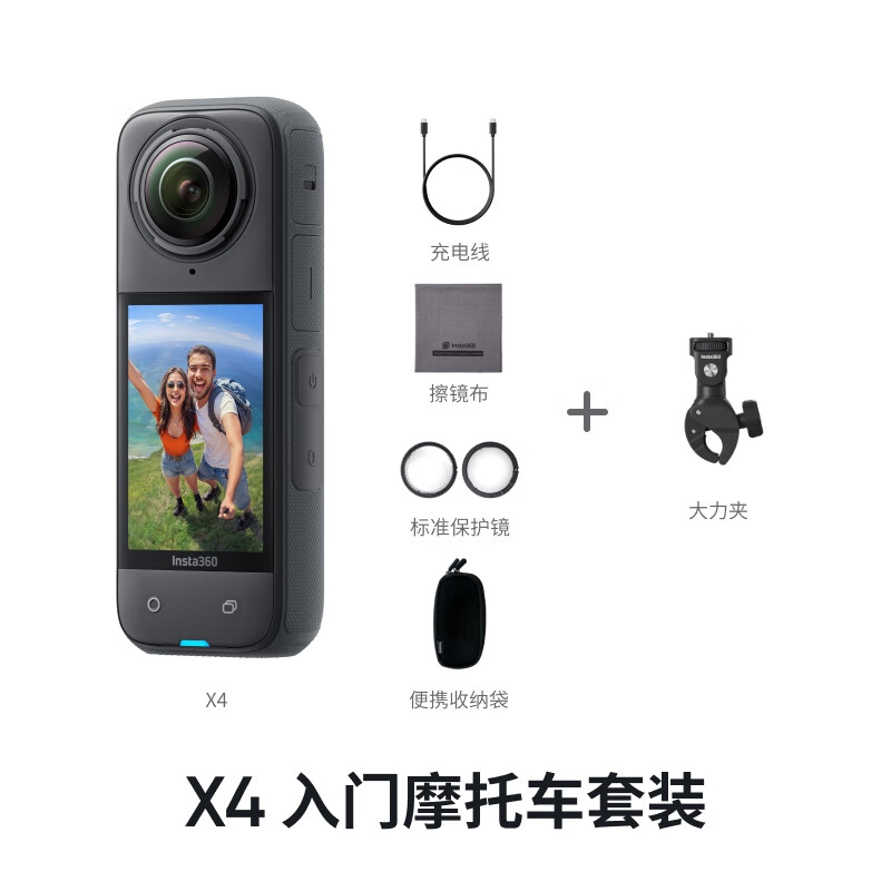 Insta360影石 X4 全景运动相机8K高清防抖防水摄像机Vlog摩托车骑行滑雪潜水路亚(入门摩托车标配版)价格:3718.00元!