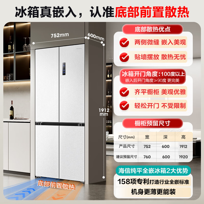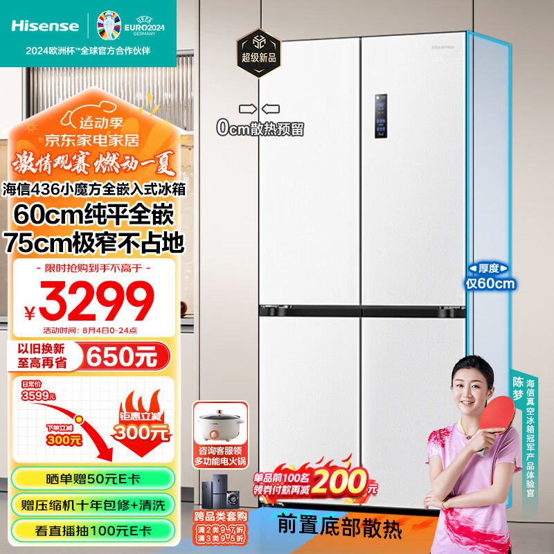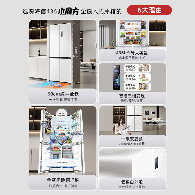 海信(Hisense)436小魔方全嵌入式冰箱一级能效60cm四开门超薄零嵌入式冰箱平嵌十字无霜BCD-436WMK1PUQ冰箱价格:3599.00元!