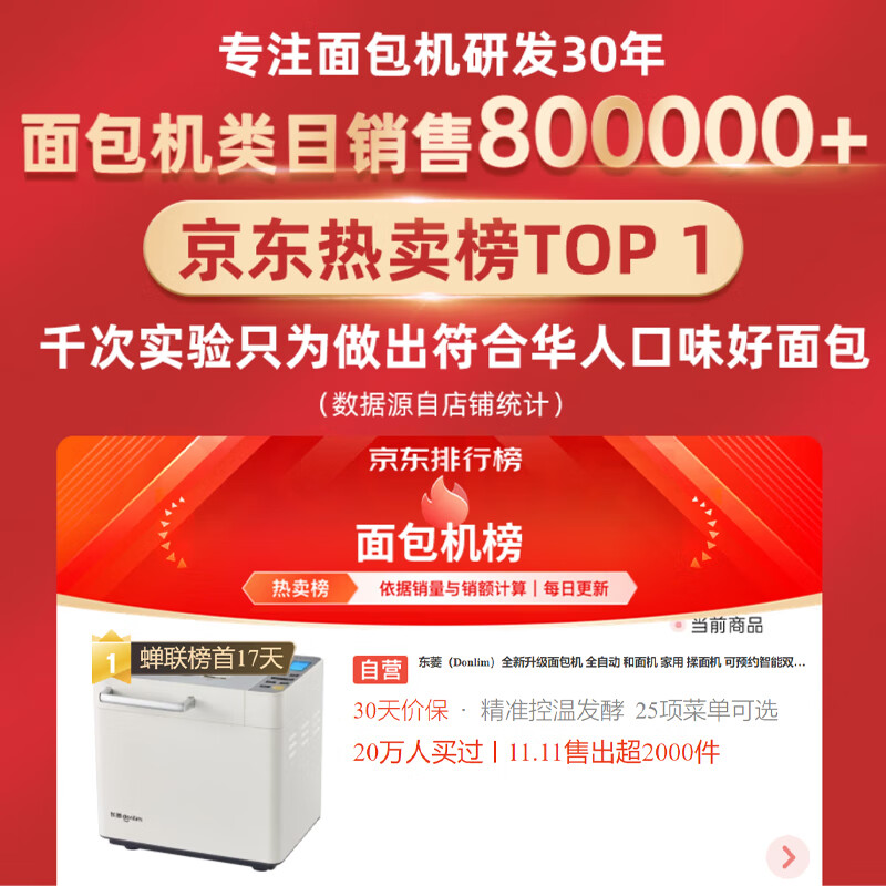 东菱(Donlim)全新升级面包机 全自动 和面机 家用 揉面机 可预约智能双撒 高成功率面包机DL-4705(白色)价格:599.00元!