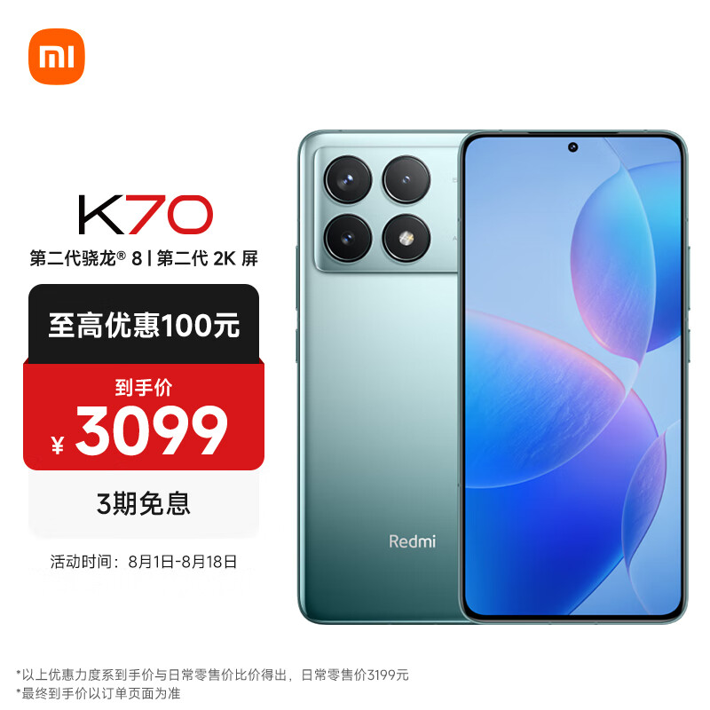 小米Redmi K70 第二代骁龙8 澎湃OS 16GB+1T 竹月蓝 红米5G手机 SU7 小米汽车互联 AI手机价格:3099.00元!