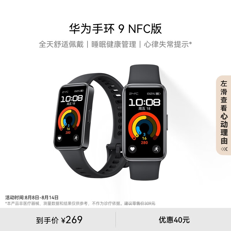 华为[七夕节礼物]手环9 NFC版 智能手环 星空黑支持NFC电子门禁快捷支付公交地铁运动手环华为手表价格:269.00元!