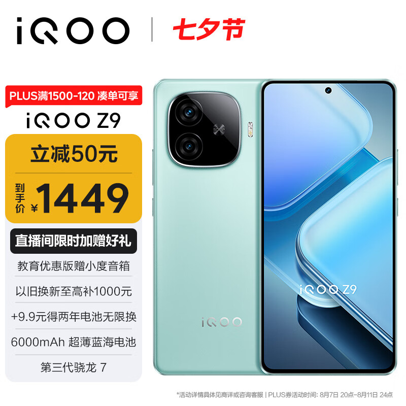 vivo iQOO Z9 8GB+128GB 山野青 6000mAh 蓝海电池 1.5K 144Hz 护眼屏 第三代骁龙 7 电竞手机价格:1499.00元!