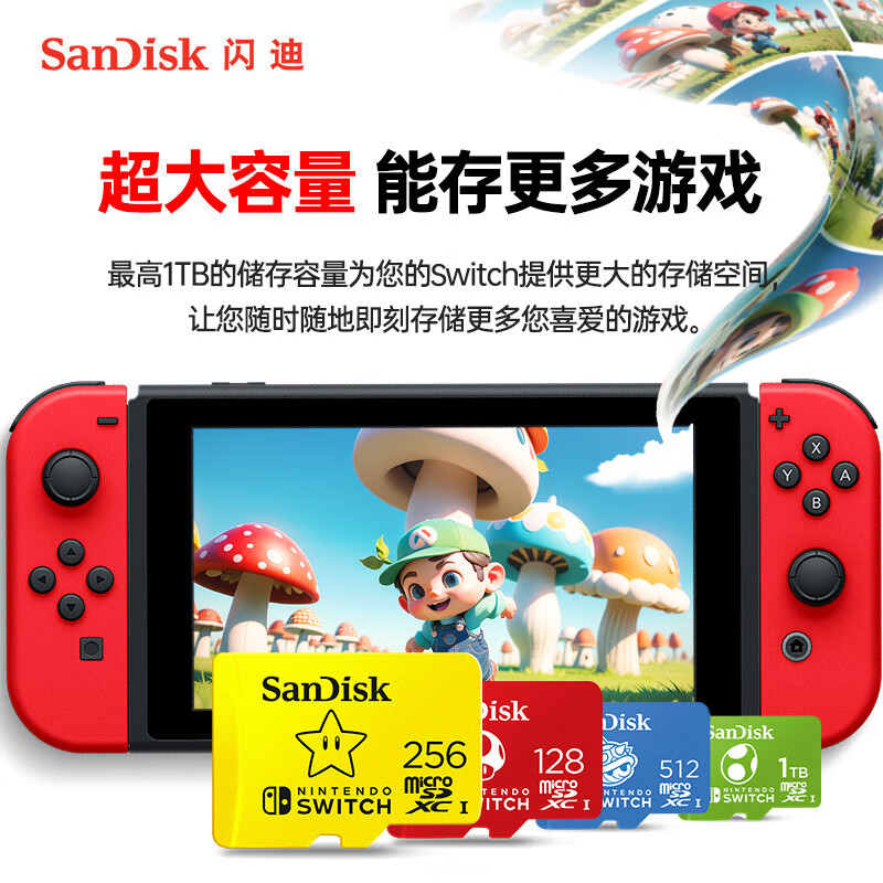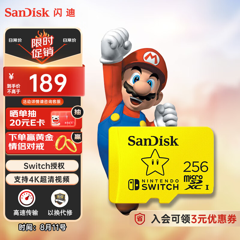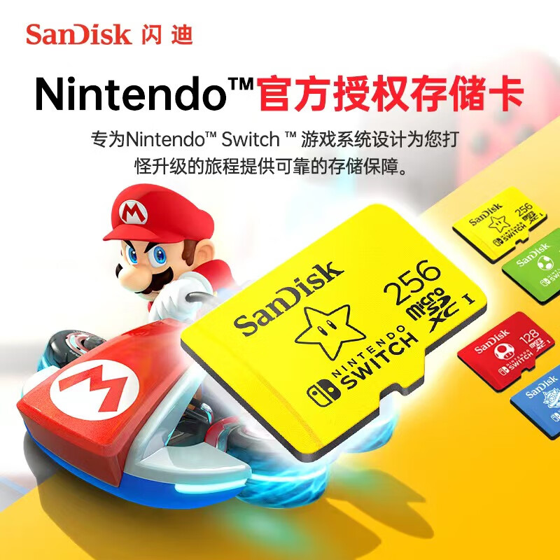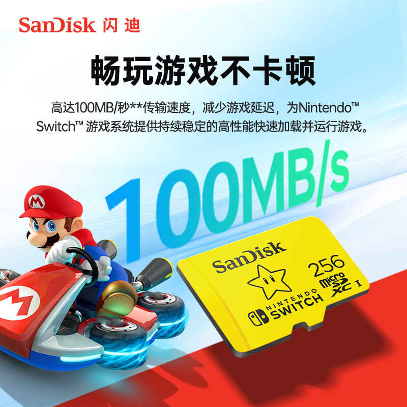 闪迪(SanDisk)256GB TF(MicroSD)内存卡 U3 4K 游戏存储卡 读速100MB/s Switch任天堂授权 超级马里奥主题款价格:189.00元!