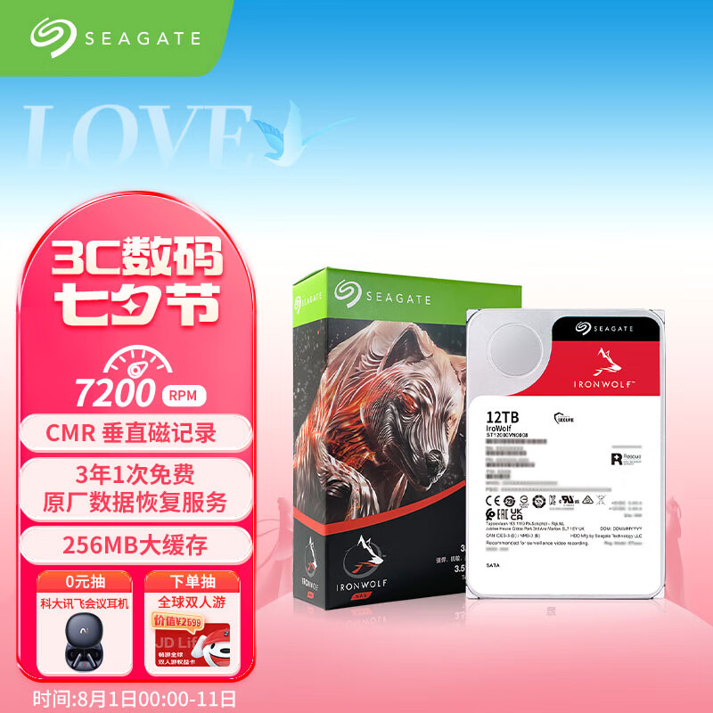希捷(SEAGATE)NAS硬盘 12TB 256MB 7200转 CMR垂直 网络存储 SATA 希捷酷狼 机械硬盘 数据恢复服务 3.5英寸价格:2499.00元!