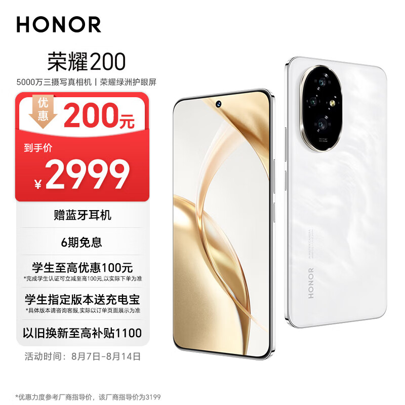 荣耀200 旗舰级青海湖电池 绿洲护眼屏 5000万雅顾光影主摄 第三代骁龙7 AI 16+512 月影白 5G价格:2999.00元!