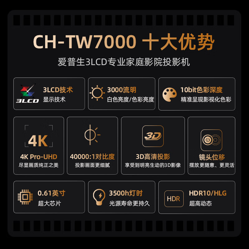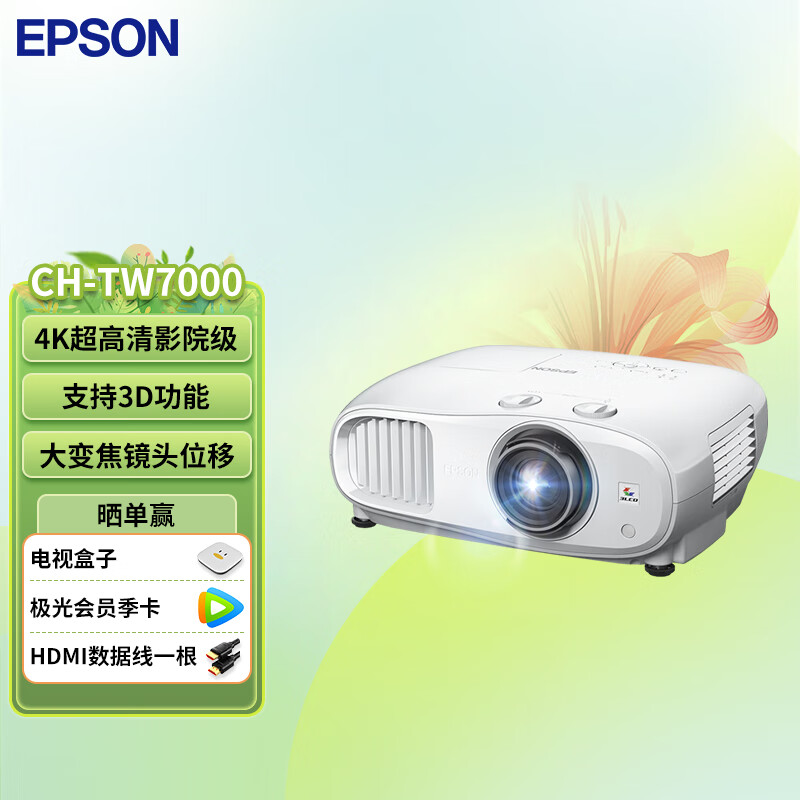爱普生(EPSON)CH-TW7000 投影仪 投影机家用(4K超高清 3000流明 1.6倍大变焦 HDR10 支持3D)标配价格:9999.00元!
