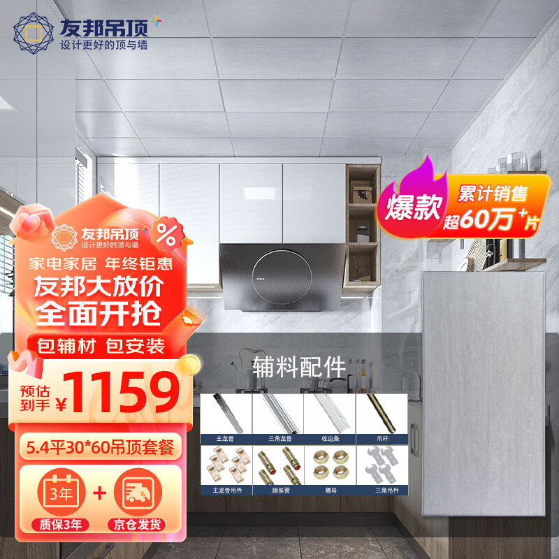 友邦(YOUPON) 集成吊顶铝扣板包安装300*600厨房阳台卫生间家用大板吊顶铝扣板 【5.4平-含辅料】30*60风雅灰价格:1499.00元!